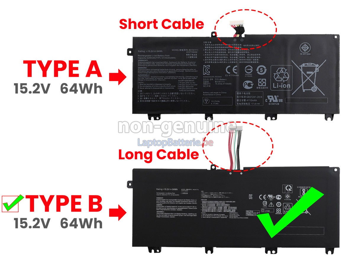 Les modèles compatibles avec la batterie pour Asus FX705GD ne sont pas listés complètement. Si vous n'êtes toujours pas sûr de l'adaptation de cette batterie à votre ordinateur portable Asus, veuillez cliquer sur « Consultation de modèle de batterie » pour obtenir de l'assistance.