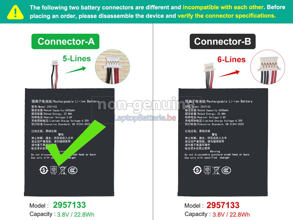 Les modèles compatibles avec la batterie pour Teclast P30T ne sont pas listés complètement. Si vous n'êtes toujours pas sûr de l'adaptation de cette batterie à votre ordinateur portable Teclast, veuillez cliquer sur « Consultation de modèle de batterie » pour obtenir de l'assistance.